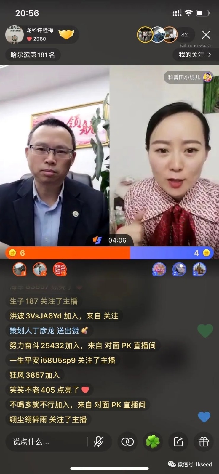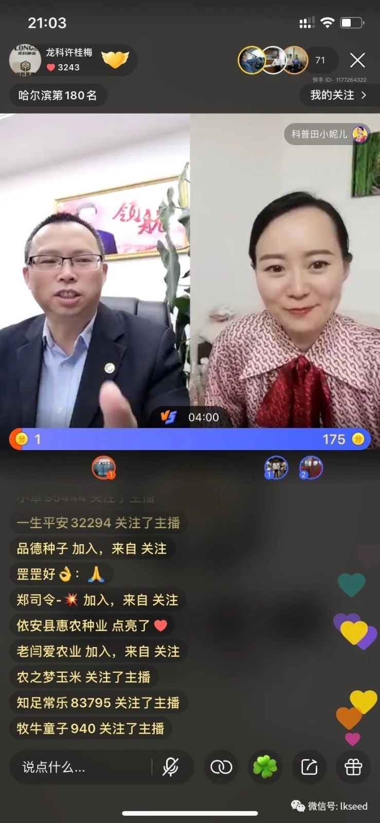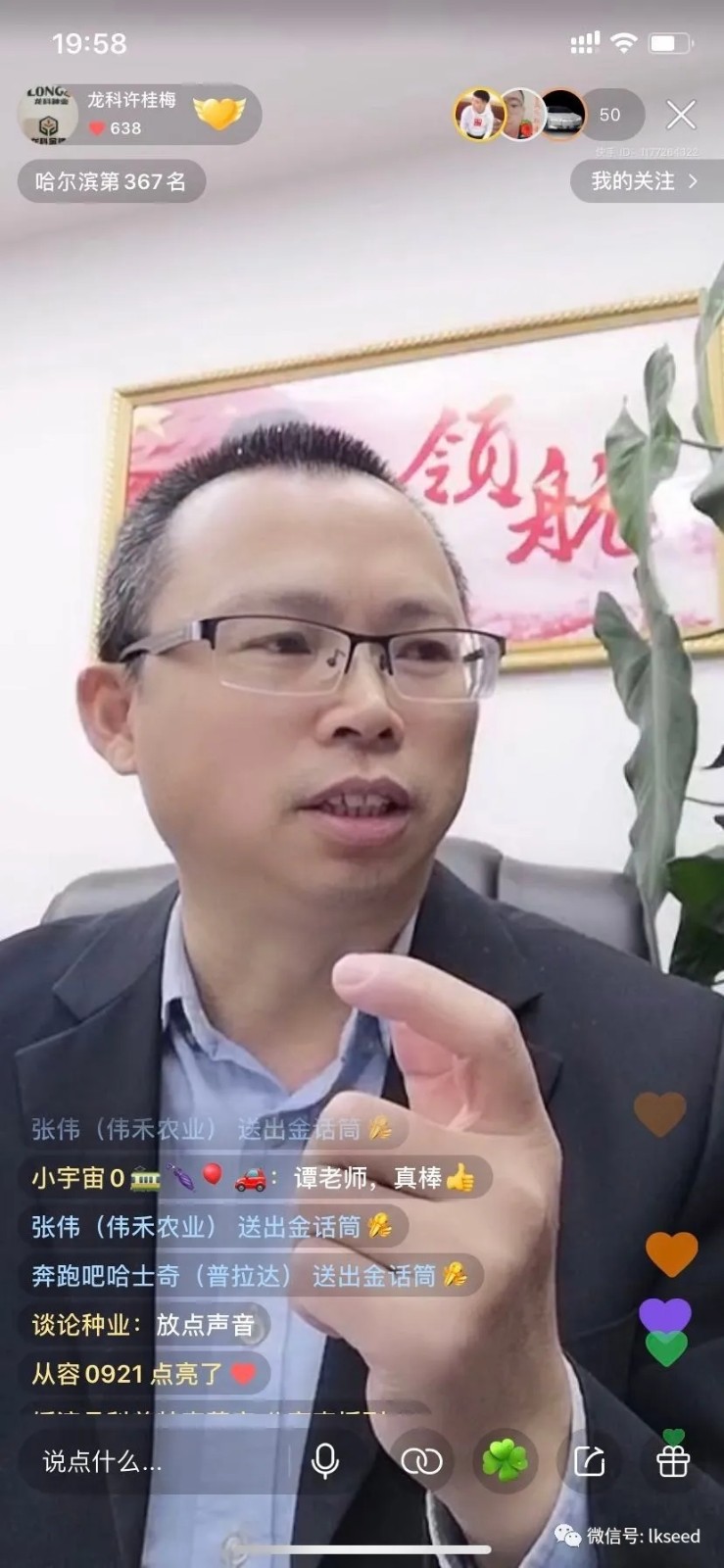 3月1日晚間8點(diǎn),黑龍江省龍科種業(yè)集團(tuán)有限公司總經(jīng)理譚春平做客快手平臺直播間,通過線上直播的形式,分析2020年我省備春耕農(nóng)業(yè)生產(chǎn)形勢、種業(yè)市場的供求趨勢,現(xiàn)場解答觀眾提問,推薦優(yōu)質(zhì)農(nóng)作物品種和種植技術(shù)。譚春平總經(jīng)理認(rèn)為:疫情之下,大家對今年我省農(nóng)業(yè)生產(chǎn)要堅(jiān)定信心,不要焦躁,更不要悲觀。雖然抗擊疫情形勢嚴(yán)峻,但我們積極響應(yīng)中央、省政府號召,在省農(nóng)投集團(tuán)黨委的統(tǒng)一部署下,做好充分準(zhǔn)備,為全省廣大農(nóng)戶準(zhǔn)備了充足的生產(chǎn)用種。目前,龍科種業(yè)全體員工正加緊生產(chǎn),積極調(diào)運(yùn),全力保證各地的大豆、水稻、玉米的種子供應(yīng)。為保證2020年我省糧食生產(chǎn)再奪豐收,保障國家糧食安全貢獻(xiàn)力量!同時(shí),也建議要將這次疫情作為調(diào)整農(nóng)業(yè)種植結(jié)構(gòu)、生產(chǎn)方式、經(jīng)營模式一次轉(zhuǎn)型升級的機(jī)遇。積極轉(zhuǎn)變思維、開拓新模式,各種子企業(yè)要好內(nèi)功,快速向移動(dòng)互聯(lián)思維模式轉(zhuǎn)型。積極開拓種子的線上銷售渠道,利用微信、直播等形式創(chuàng)新營銷模式,為我省農(nóng)業(yè)生產(chǎn)提供種子保障。龍科種業(yè)此次大講堂活動(dòng),就是要讓經(jīng)銷商、廣大農(nóng)民對公司、對農(nóng)業(yè)充滿信心。隨后連線黑龍江廣播電視臺——公共?農(nóng)業(yè)頻道主持人田妮的直播間,為田妮直播間的觀眾解讀、分析國家農(nóng)業(yè)政策。此次直播吸引大量人員在線觀看,積極參與現(xiàn)場公屏互動(dòng),場面十分火爆、熱烈。